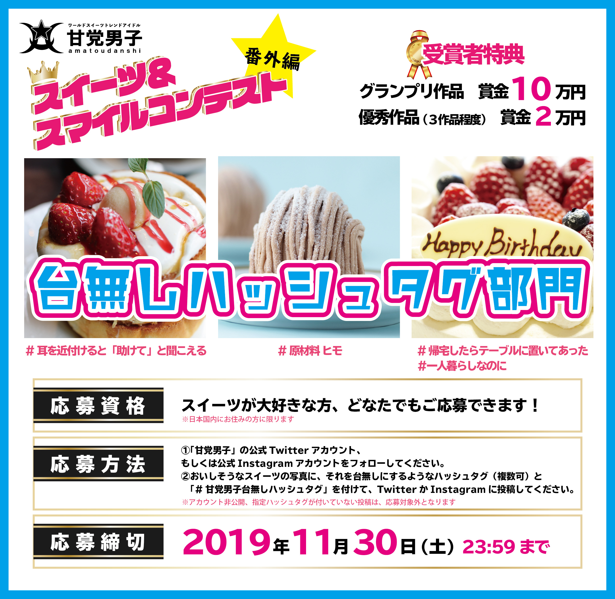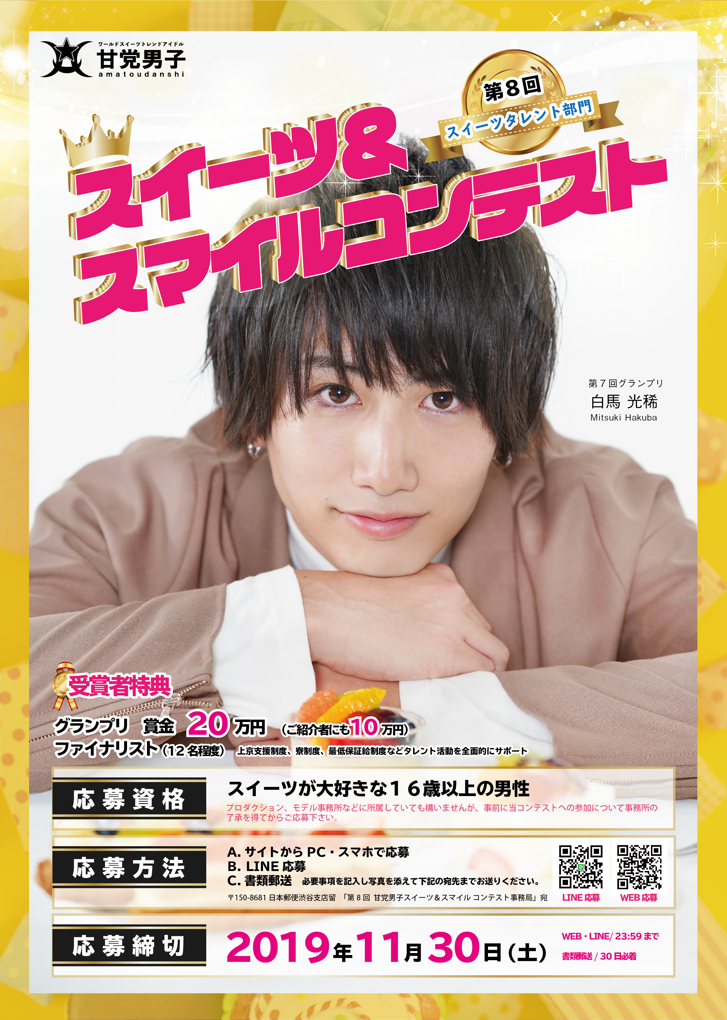 第8回スイーツ&スマイルコンテスト 応募開始 2019年11月3日 by 甘党男子運営 【第8回スイーツ&スマイルコンテスト】 スイーツタレントを目指す 「スイーツタレント部門」 グランプリには賞金20万円! どなたでも応募可 「台無しハッシュタグ部門」 グランプリには賞金10万円! 応募方法は特設ページよりご確認下さい https://wp.me/PadbRf-D0